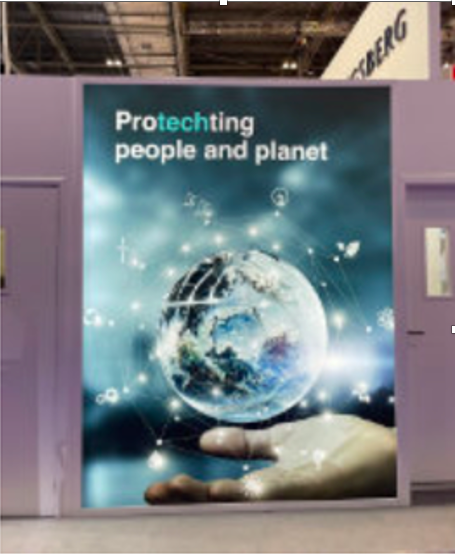 Die norwegische Waffenfirma Kongsberg hat eine Klimaschutzbotschaft an ihrem Stand auf der Londoner Waffenmesse DSEI, September 2023 (Foto: Nico Edwards)