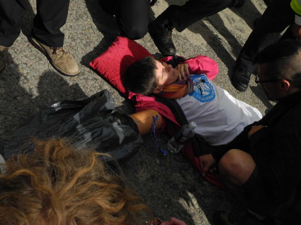 Während wir im Hotel waren, standen die übrigen Aktiven aus aller Welt davor und begleiteten die einfahrenden Gäste mit ihren Slogans: „Arms Dealers: You are not welcome!“ (Waffenverkäufer, Ihr seid nicht willkommen!) Oder “War starts here!” (Krieg beginnt hier).